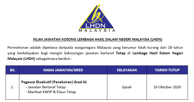 Jawatan Kosong Terkini Lembaga Hasil Dalam Negeri Lhdn Tutup 16 Oktober 2020 Mingguan Kerja