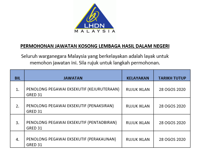 Permohonan Jawatan Kosong Di Lembaga Hasil Dalam Negeri Lhdn Dibuka Ogos 2020 Info Jawatan Kosong Terkini Di Malaysia