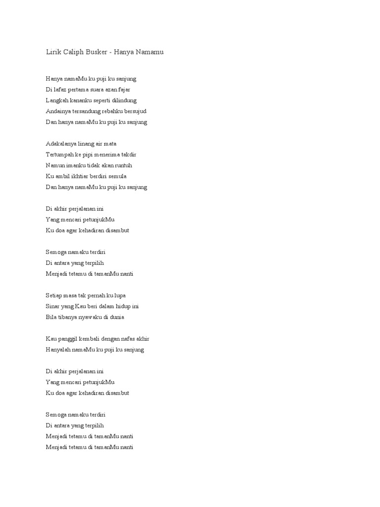 Lirik hanya namamu by caliph buskers. Post comments atom recommended for you. Hanya namamu ku puji ku sanjung di lafaz pertama suara azan fajar langkah kananku seperti. Posted by unknown at 1 45 pm.
