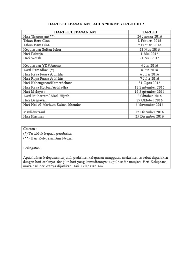 National Holidays In Johor In 2016 Office Holidays